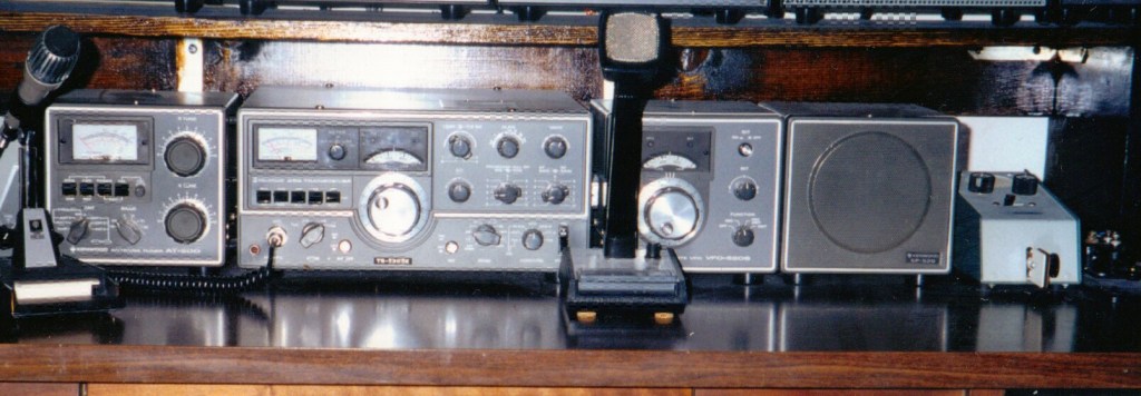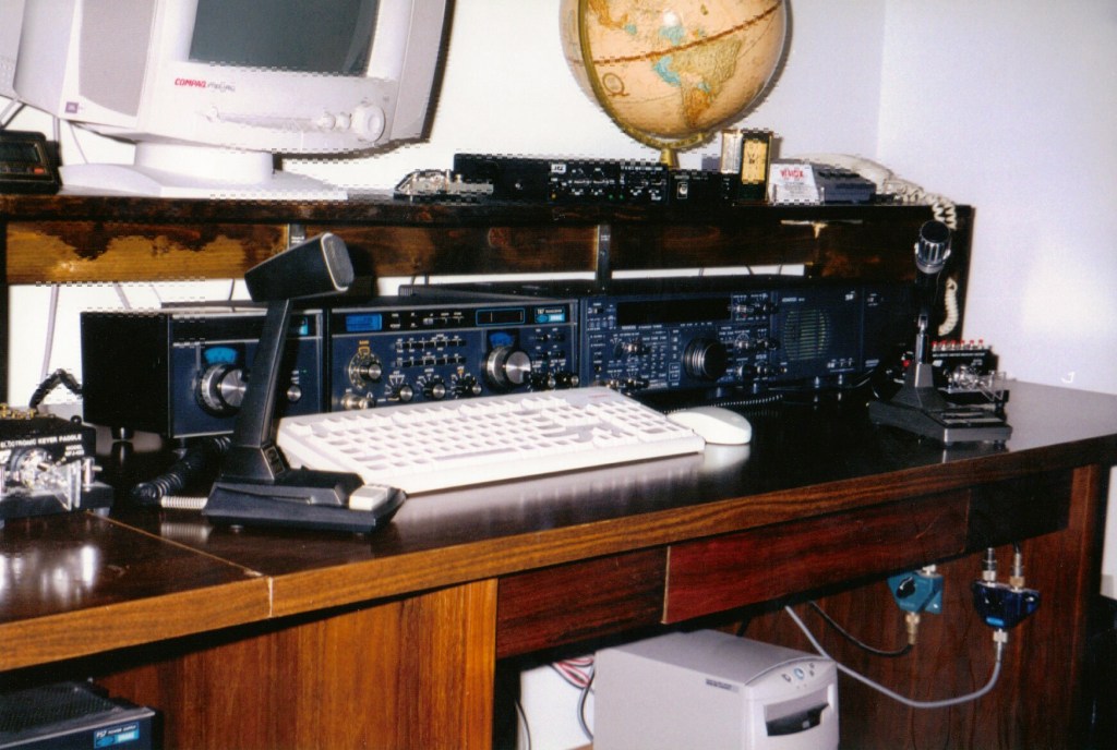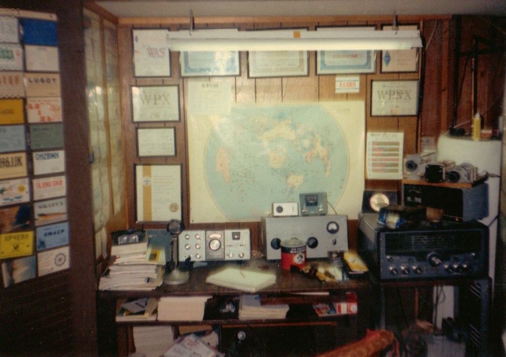 Circa 1990 running a Kenwood TS-140S with the automatic antenna tuner (AT-250). The antenna was a G5RV and I had the pleasure of working G5RV with that station. You can see the SX-101A behind my chair. This picture appeared in CQ for one of the contests.